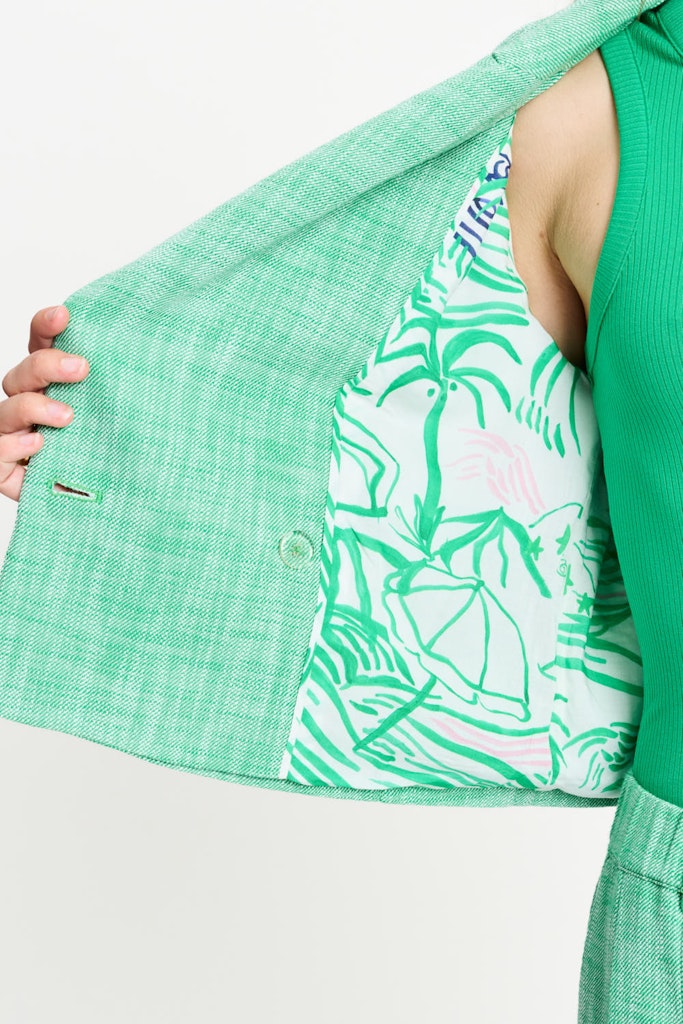 Deze groene dames blazer van het merk Pom is perfect voor de zomer. De korte mouwen en V-hals geven het een vrouwelijke uitstraling. De blazer is gemaakt van 100% katoen en heeft een knoopsluiting. De blazer is van het merk Pom en past perfect bij de merkstijl. In 2026 zal deze blazer nog steeds een must-have zijn voor elke vrouw.