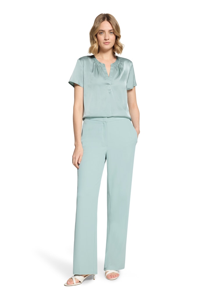 Deze stijlvolle dames blouse van Betty Barclay is perfect voor de zomer. De blouse heeft een korte mouw en is gemaakt van 97% polyester en 3% elastaan, wat zorgt voor een comfortabele pasvorm. De blouse is uitgevoerd in een prachtige groene kleur, genaamd Gray Mist, die perfect past bij het vrouwelijke geslacht. De blouse is gemakkelijk te onderhouden, want hij kan op lage temperatuur gestreken worden. Met deze blouse ben je helemaal klaar voor de zomer van 2026.