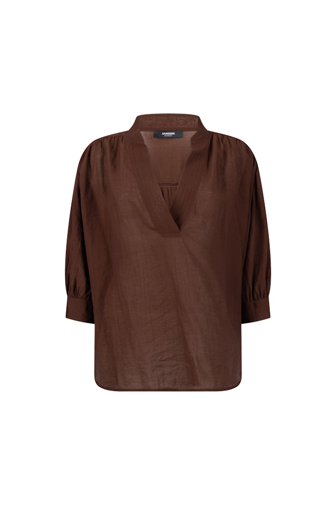 Deze bruine dames blouse van het merk Jansen Amsterdam is een must-have voor elke vrouwelijke kledingkast. De blouse heeft een V-hals en half lange mouwen, waardoor het perfect is voor de zomer. Het materiaal van 81% viscose en 19% polyamide of nylon zorgt voor een comfortabele en luchtige fit. De blouse is perfect te combineren met verschillende outfits en is geschikt voor elke gelegenheid. Met deze blouse ben je helemaal klaar voor het zomerseizoen van 2026.