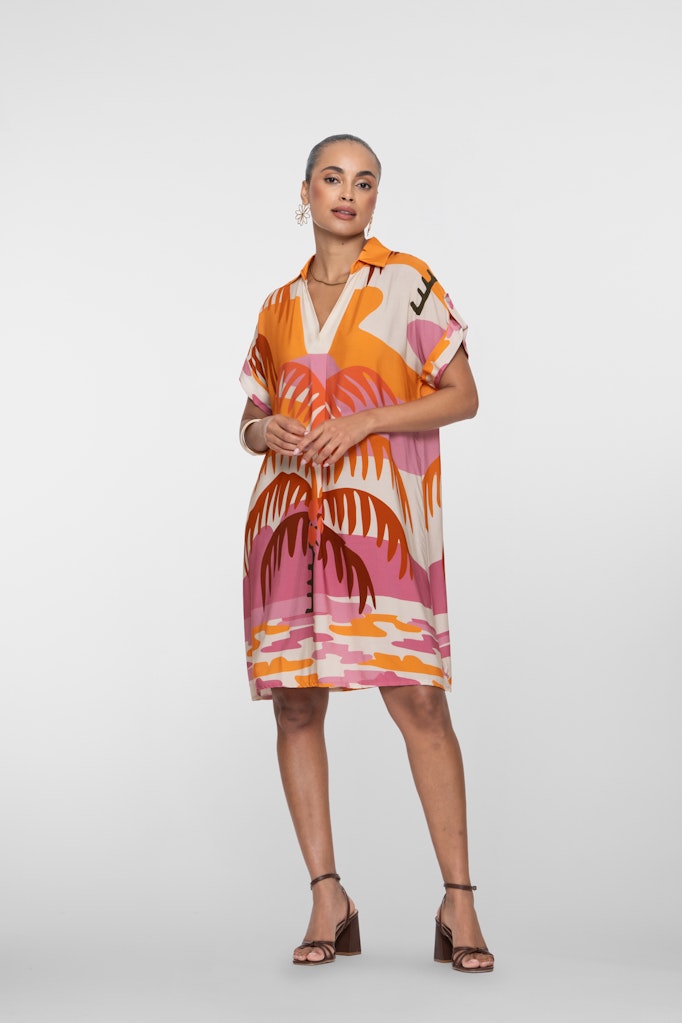 Deze prachtige damesjurk van het merk Geisha is perfect voor de zomer. De jurk heeft een vrouwelijke V-hals en korte mouwen, waardoor het een luchtige en stijlvolle uitstraling heeft. De roze print geeft de jurk een speelse en trendy touch. Gemaakt van 100% viscose, voelt de jurk heerlijk zacht en comfortabel aan op de huid. Met deze jurk ben je helemaal klaar voor het zomerseizoen van 2026.