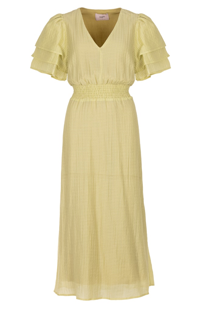 Deze prachtige gele jurk van Freebird is perfect voor de zomer. De korte mouwen en V-hals geven de jurk een vrouwelijke uitstraling. De jurk is gemaakt van 68% Lyocell en 32% polyamide, wat zorgt voor een comfortabele en luchtige pasvorm. De groene accenten geven de jurk een speelse touch en maken het een echte eyecatcher. Deze jurk is een must-have voor elke vrouw die graag stijlvol en trendy voor de dag wil komen. Met deze jurk ben je helemaal klaar voor het zomerseizoen van 2026.