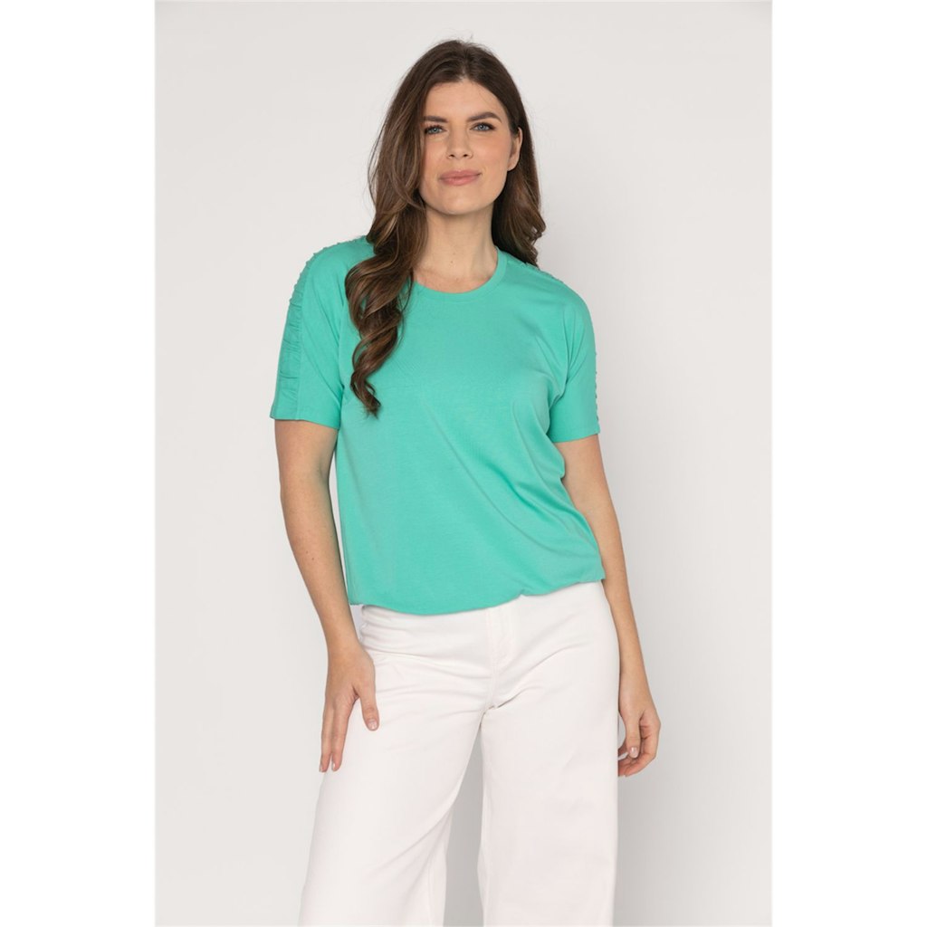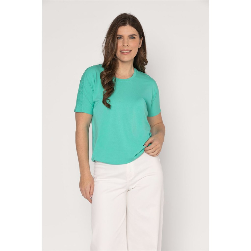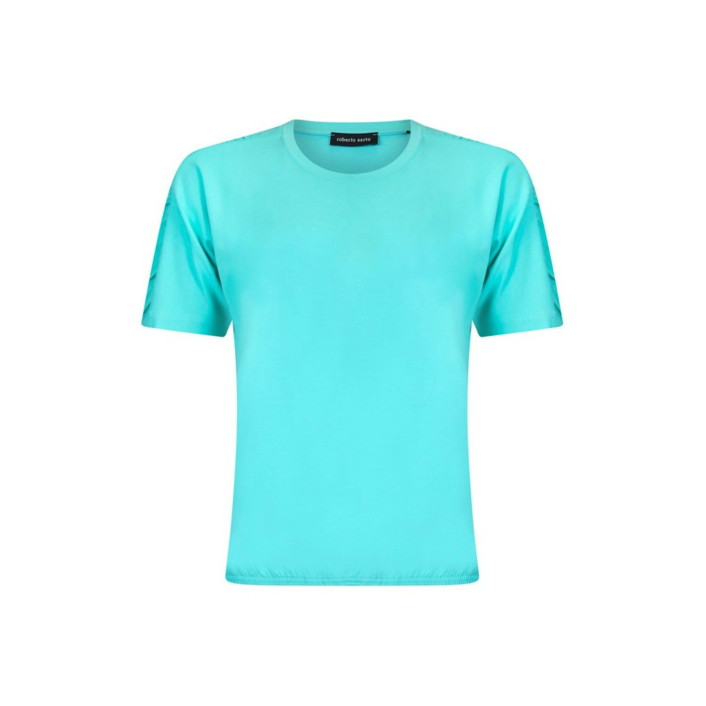 Het dames T-shirt van het merk Roberto Sarto is perfect voor de zomer. Het licht groene shirt heeft een ronde hals en korte mouwen, wat zorgt voor een vrouwelijke uitstraling. De kleur groen is een populaire zoekkleur en past goed bij het seizoen. Het shirt is gemaakt van hoogwaardige materialen en kan gewassen worden op 30°C fijne was/wolwas. Met dit T-shirt ben je helemaal klaar voor het jaar 2026.