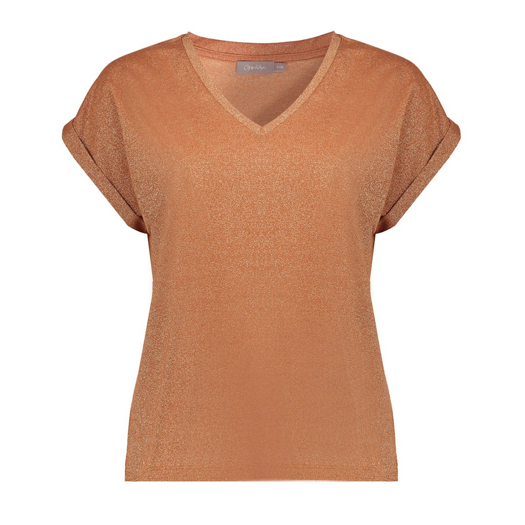 Geisha staat bekend om haar trendy en vrouwelijke kleding, en dit dames T-shirt is daar geen uitzondering op. Het bruine T-shirt is perfect voor de zomer, met korte mouwen en een V-hals. De opvallende oranje kleur geeft het shirt een speelse touch. Gemaakt van een mix van viscose, polyester en elastaan, zorgt dit T-shirt voor een comfortabele pasvorm. Een must-have voor elke vrouwelijke garderobe in 2026.