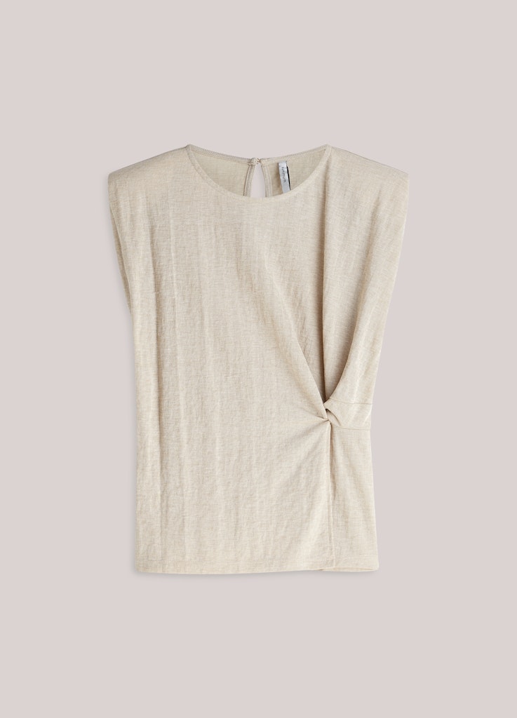 Deze prachtige beige top van Summum is een must-have voor elke vrouwelijke zomergarderobe. De mouwloze top is gemaakt van een licht en luchtig materiaal, bestaande uit 60% viscose en 40% polyamide of nylon. Dit zorgt voor een comfortabele pasvorm en maakt de top perfect voor warme zomerdagen. De top heeft een elegante uitstraling en past perfect bij de merkstijl van Summum. Het is een tijdloos item dat je nog jarenlang kunt dragen, ook in 2026. Het wordt aanbevolen om de top op lage temperatuur te strijken om de kwaliteit van het materiaal te behouden. Deze top is geschikt voor elke gelegenheid en zal zeker een favoriet worden in je kledingkast.
