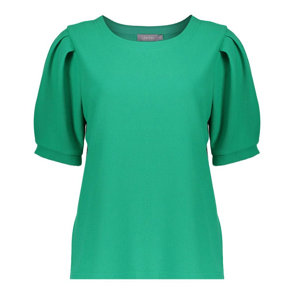 Deze groene dames top van het merk Geisha is perfect voor de zomer. De top heeft een ronde hals en korte mouwen, waardoor het een vrouwelijke uitstraling heeft. De top is gemaakt van 97% polyester en 3% elastaan, wat zorgt voor een comfortabele pasvorm. De top heeft geen sluiting en is daardoor gemakkelijk aan te trekken. De groene kleur past perfect bij het seizoen en geeft een frisse uitstraling. Met deze top ben je helemaal in stijl volgens de merkstijl van Geisha.