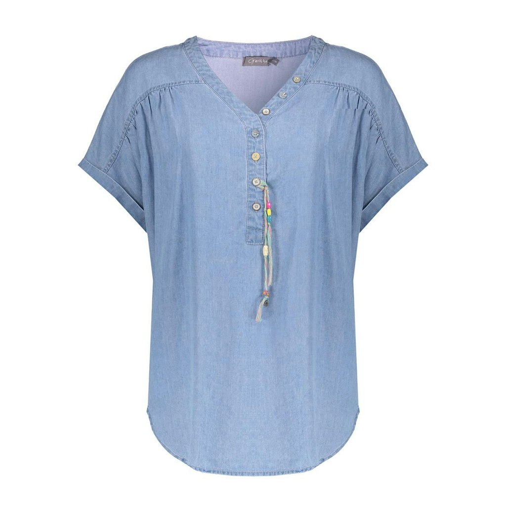 Deze lichtblauwe dames top van het merk Geisha is perfect voor de zomer. Het vrouwelijke design met korte mouwen en V-hals zorgt voor een speelse en stijlvolle look. De top is gemaakt van 100% Lyocell, wat zorgt voor een comfortabele en luchtige pasvorm. De knoopsluiting aan de voorkant geeft de top een extra detail. Met deze top ben je helemaal on-trend en klaar voor het zomerseizoen van 2026.