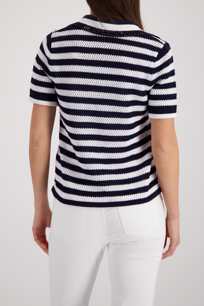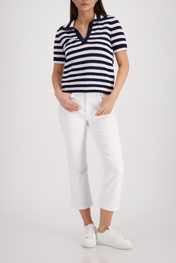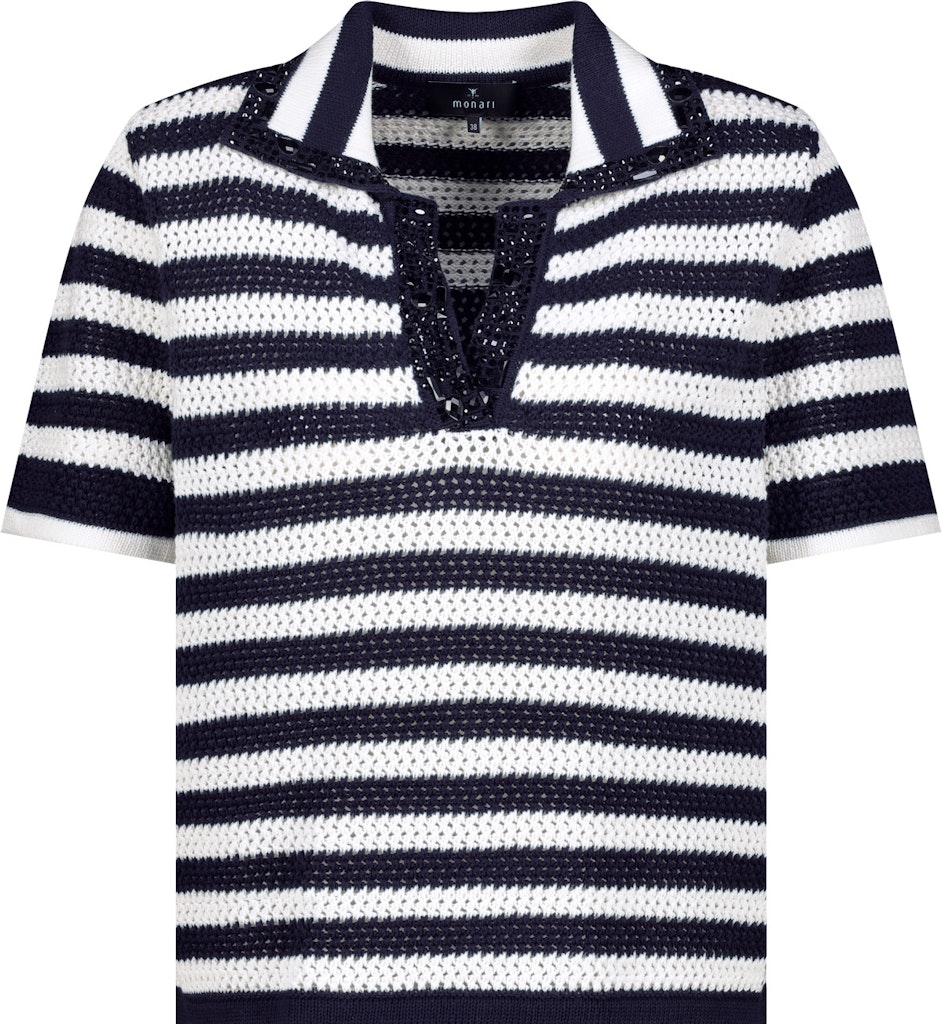 Deze stijlvolle Monari dames trui is perfect voor de zomer. De trui heeft een vrouwelijke pasvorm en is uitgevoerd in de kleur marine Ringel, wat een prachtige blauwe tint is. Het buitenmateriaal is gemaakt van 100% katoen, wat zorgt voor een comfortabele en ademende stof. De trui is gemakkelijk te wassen op 30°C fijne was of wolwas. Met deze tijdloze trui ben je helemaal klaar voor het zomerseizoen van 2026.