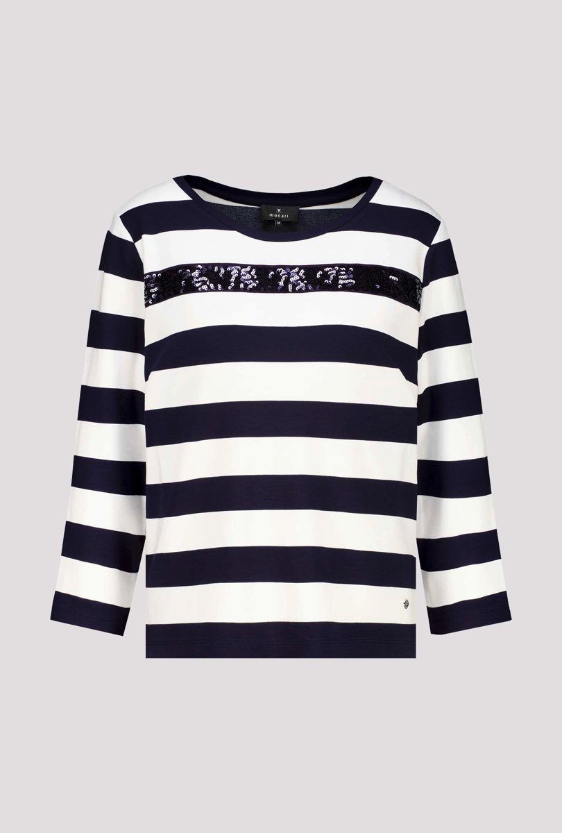 Deze prachtige dames trui van Monari is een must-have voor elke zomerse garderobe. De trui is gemaakt van hoogwaardige materialen en heeft een uniek marine Ringel patroon, wat perfect past bij de stijl van het merk. Deze trui is speciaal ontworpen voor dames en zal zeker een favoriet worden in 2026. Upgrade je zomergarderobe met deze stijlvolle en tijdloze trui van Monari.
