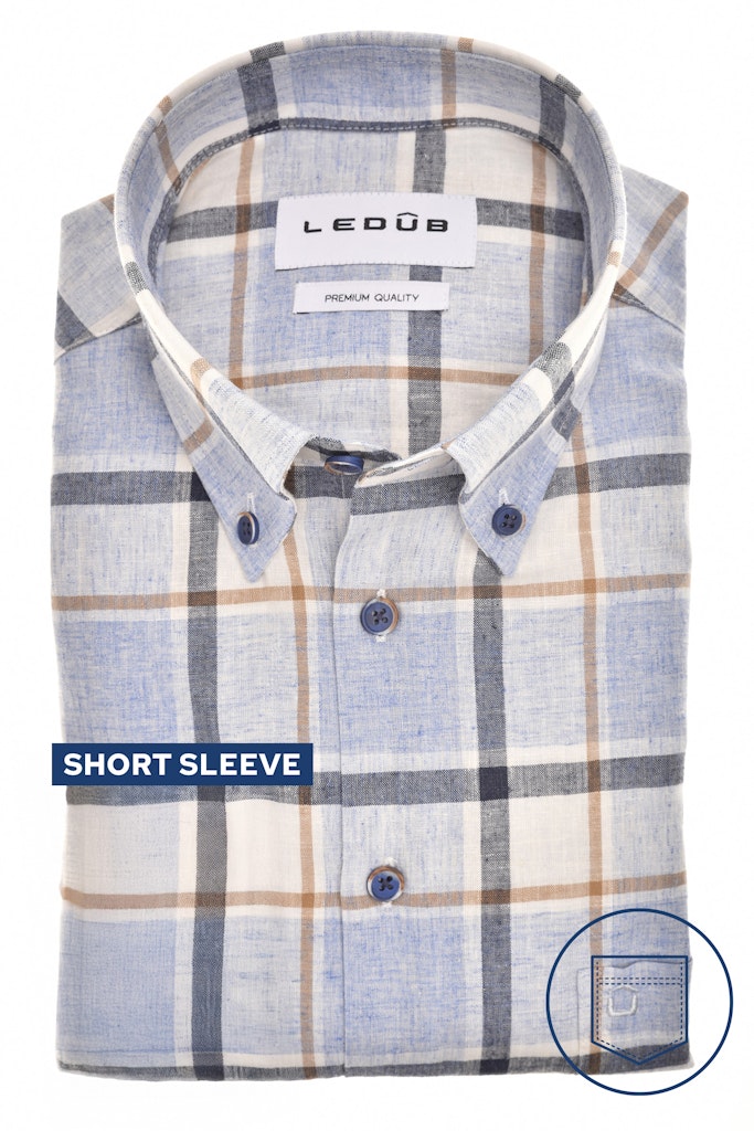 Dit donkerblauwe Ledub overhemd is perfect voor de moderne man tijdens de zomer. Het overhemd heeft een korte mouw en een moderne pasvorm, waardoor het comfortabel en stijlvol is. Het merk Ledub staat bekend om zijn kwalitatieve en tijdloze heren overhemden. Dit overhemd is gemaakt van 70% katoen en 30% vlas of linnen, waardoor het licht en ademend is voor warme zomerdagen. Het overhemd is eenvoudig te combineren met verschillende outfits en kan zowel casual als zakelijk gedragen worden. Het is een must-have item voor elke man in 2026. Volg de wasvoorschriften en laat het drijfnat hangend drogen voor een lange levensduur van dit prachtige blauwe overhemd.