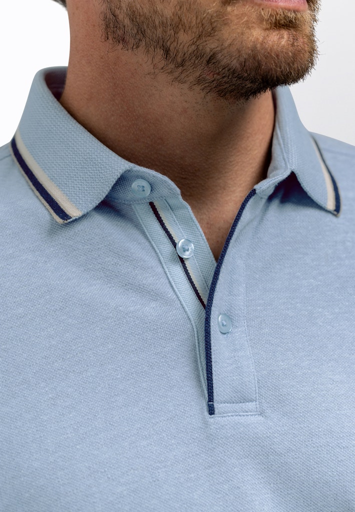 Deze heren polo van State of Art is perfect voor de zomer. Het blauwe shirt is gemaakt van een mix van 50% vlas of linnen en 50% katoen, waardoor het zacht en luchtig aanvoelt op de huid. De polo heeft een klassieke pasvorm en korte mouwen, waardoor het een tijdloze en stijlvolle toevoeging is aan elke herengarderobe. De lichtblauwe kleur geeft het shirt een frisse uitstraling en past perfect bij het zomerseizoen. Met deze polo ben je helemaal klaar voor de zomer van 2026.